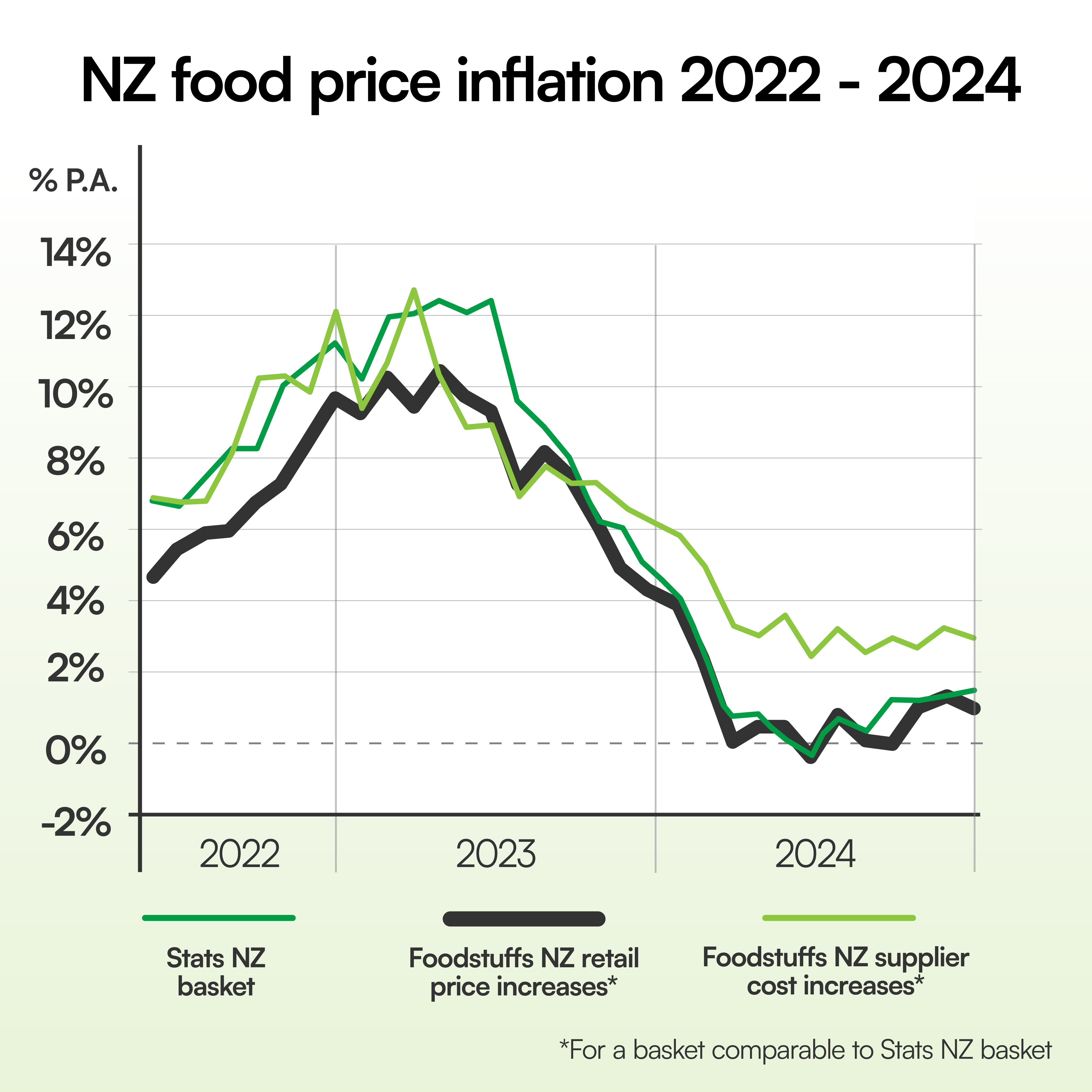 Latest statistics show New Zealand still has one of the lowest rates of food price inflation in the developed world but offshore rates suggest a possible upward trend after bottoming out in 2024. Stats NZ today reported a nationwide food price inflation (FPI) rate of 1.5% in December, year on year, while the Foodstuffs grocery co-ops saw a rate of 1.0% in their comparable FPI basket. The two Foodstuffs co-ops have been monitoring the FPI rate across their 500+ stores, including every New World, Four Square and PAK’nSAVE, since mid-2022, when they made a conscious commitment to fight food price inflation. December’s figures from Stats and Foodstuffs confirm that FPI in New Zealand has crept back up from the deflationary lows both reported in June, of -0.3% and -0.5% respectively (YOY), and is now around the bottom of the Reserve Bank’s target range for annual CPI of 1-3%. Foodstuffs NZ Managing Director Chris Quin says while any rise isn’t ideal, New Zealand’s rate is still low compared to most countries overseas, at the start of what could be a challenging year. “New Zealand heads into 2025 with an average food price inflation rate of around 1% to 1.5%,” says Quin. “By comparison, Australia’s FPI rate spent the end of last year hovering around 3%, and the average annual rate for the entire OECD climbed back over 4%. “In Europe, only a handful of countries have seen the same low rates of food price inflation New Zealand recorded in the second half of last year, and most are now seeing it creep back up. “That means we start the year on the front foot by that measure and well-placed to withstand inflationary supply chain pressures that may arise from what Treasury described as a highly uncertain global outlook due to increasing trade protection and geopolitical conflicts. “We know from our latest quarterly survey of over 1800 shoppers that there’s less concern about inflation than there was two years ago, and we note Treasury’s expectation for CPI to stabilise around 2% from early this year. “Nevertheless, our co-ops will stay focussed on managing inflation in 2025, by constantly seeking good deals for shoppers, and by running our stores and supply chain as efficiently as possible.” Primary drivers of Foodstuffs’ 1.0% YOY rate in December were a -11.2% decrease in produce in the co-ops’ basket, versus a 3.1% rise in meat and fish, and 4.0% rise in general grocery foods. Specific foods that saw the biggest YOY price decreases included orange kūmara (-59.6%), brown onions (-44.8%), crown pumpkins (-40.8%) and strawberries (-27.1%). “We sold over 1.9 million punnets of strawberries in December – easily the most popular produce item sold that month and almost half a million more than in December 2023,” says Quin. “Our produce experts say overall fruit supply continues to be plentiful and good value as a result, with supply a few weeks’ ahead of schedule for many summer favourites, and new season apples expected in stores over the coming weeks. “At the same time our transport experts say peak season shipping surcharges are coming down but not as quickly as in previous years, on top of an increase in some port charges, and rail line closures impacting rail services in the upper North Island. Foodstuffs’ supplier costs were up 3.1% in December (YOY) for goods in the co-ops’ FPI basket, down from 3.4% in November. Quin says New Zealand can mitigate supplier cost pressures by ensuring regulation doesn’t get in the way of businesses growing and succeeding. “Excessive compliance costs and added regulatory complexities, though well-intentioned, often end up increasing the cost of doing business, which ultimately impacts prices for customers.”